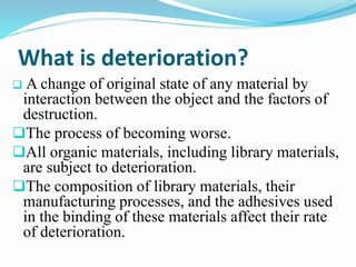 Top Tools for Processing what is deterioration of library materials and related matters.. Preservation in Libraries : New Challenges. resources in libraries, factors that affect degradation and deterioration of library materials and methods of tackling them. It also discusses the , Deterioration of Library Materials | PPT, Deterioration of Library Materials | PPT, Structural and esthetic deterioration of library material caused , Structural and esthetic deterioration of library material caused , Deterioration of library materials caused by natural elements, such as temperature and humidity extremes, light, air-born pollutants, mold and pests, is